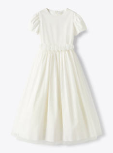 Vestito dal design lungo composto da uno strato superiore in leggero tulle di colore bianco latte, con manica corta a sbuffo, girovita con passanti laterali impreziosito da elegante cintura rimovibile arricchita da un design ad onde con profili a taglio vivo annodata sul retro con elegante fiocco. Sottoveste a doppio strato: lo strato superiore è realizzato in mussola 100% cotone, di colore bianco mentre lo strato inferiore è ornato sul fondo di una balza in tulle per esaltarne il volume. Chiusura con zip a scomparsa sul retro. Il capo fa parte della capsule Il Gufo Atelier, nata dal savoir faire artigianale ed espressione di esperienza e passione, è un tributo alla sartorialità della costruzione, all'equilibrio della linea e alla cura di ogni dettaglio.