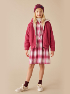 Robe chemisier en techno-wool à motif carreaux avec col de chemise, boutonnage frontal et jupe ample. Poches latérales et détail de carré au dos.