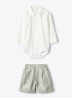 Completo da neonato composto da una camicia dal taglio classico, con colletto all'italiana, abbottonatura frontale e particolare di bottone sui polsini. Il fondo realizzato in jersey, dotato di bottoni automatici, assicura una vestibilità pratica e comoda. I bermuda in shantung di lino, con elastico in vita, finta zip e risvolto, sono foderati internamente in cotone per un comfort extra. Il capo fa parte della capsule Il Gufo Atelier, nata dal savoir faire artigianale ed espressione di esperienza e passione, è un tributo alla sartorialità della costruzione, all'equilibrio della linea e alla cura di ogni dettaglio.