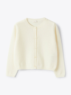 Crew neck cardigan in pure cashmere with front button closure. Ribbed finishes.