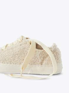 Sneaker with a curly fabric upper, laces, and anti-slip rubber sole.